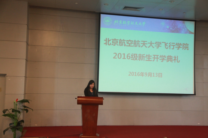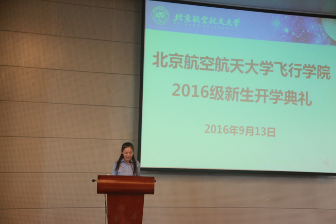 学院第一届女飞班班长贾蕙谦同学作为新生代表上台发言,贾蕙谦同学代表新生发出几点倡议,倡导大家认真学习,严格要求自己,做一名合格的飞行学员。
