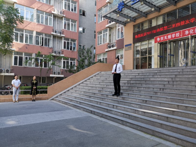 首先,学员们向领导们展示了队列表演。在领队苏子鹏同学的指挥下,学员们迈着整齐的步伐,喊着嘹亮的口号齐步走至二公寓楼前。他们用干净利落的动作配以坚定的眼神展现出国学员应有的信心与决心。